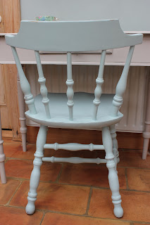 This stock wooden kitchen chair has been painted in a duck-egg blue and rubbed back just a little. Perfect as part of a harlequin set, or as a stand alone seat at a desk or dressing-table.